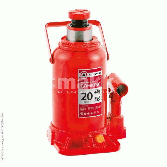Автомобильный гидравлический домкрат с рабочей высотой до 440 мм. В сложенном состоянии занимает всего 235 мм по высоте. Максимальный груз — 20 тонн. Встроенная защита от перегруза. Перепускной клапан допускает перегрузку на 25%, но препятствует использованию домкрата при недопустимой нагрузке. Бутылочный домкрат предназначен для работы на твердой и ровной поверхности. После подъема груза он должен быть зафиксирован на страховочных опорах (продаются отдельно).