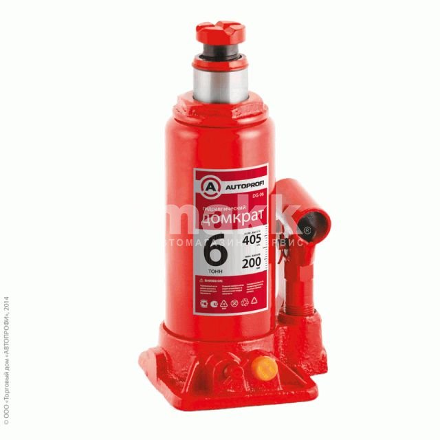 Автомобильный гидравлический домкрат с рабочей высотой до 405 мм. В сложенном состоянии занимает всего 200 мм по высоте. Максимальный груз — 6 тонн. Встроенная защита от перегруза. Перепускной клапан допускает перегрузку на 25%, но препятствует использованию домкрата при недопустимой нагрузке. Бутылочный домкрат предназначен для работы на твердой и ровной поверхности. После подъема груза он должен быть зафиксирован на страховочных опорах (продаются отдельно).