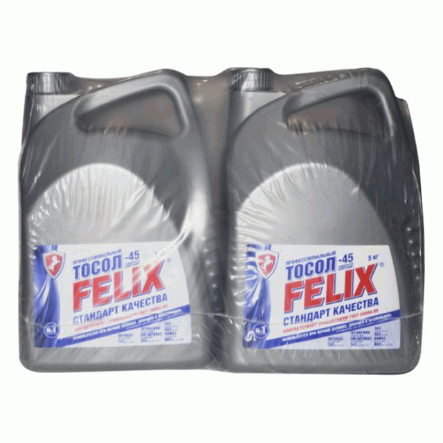 Тосол 45 FELIX 5кг Профессиональный тосол FELIX – 45 – это современная охлаждающая жидкость, соответствующая требованиям международных стандартов. Обеспечивает 100% защиту двигателя и деталей системы охлаждения от коррозии, перегрева, замерзания до -45°С - специальная формула присадок обеспечивает мгновенную защиту деталей системы охлаждения во всем диапазоне рабочих температур и давлений. По сравнению с обычными тосолами обладает увеличенным ресурсом эксплуатации – 120 000 км без замены (Протокол № 32532/074-04 АвтоВАЗа). Единственный российский тосол, успешно прошедший полный цикл испытаний на российских автозаводах, и допущенный к первой конвейерной заливке. Не содержит амины и нитриты, образующие вредные для здоровья нитрозоамины и другие канцерогенные соединения. - Неагрессивен к резиновым изделиям и металлам, в том числе алюминию - Имеет низкую испаряемость и пониженное пенообразование - Сохраняет стабильность при высоких и низких температурах - Препятствует образованию накипи - Соответствует