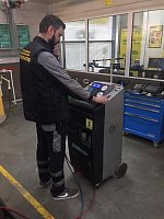 Визуально утечку обнаружить не удалось, аппарат тоже промолчал, поэтому заправляем систему кондиционирования необходимым количеством фреона. Восполняем требуемый объем компрессорного масла и добавляем в масло красящий пигмент, светящийся в ультрафиолете, дабы при повторении утечки было проще ее локализовать, а затем и устранить.