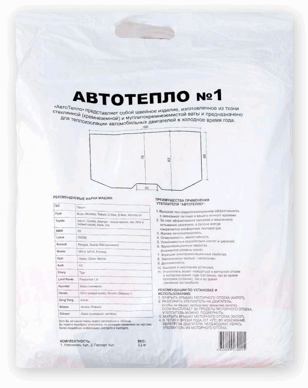 В интернет-магазине "makk" Вы можете купить утеплитель для двигателя "Автотепло №1". Универсальный и огнестойкий материал эффективно утепляет двигатель легкового и грузового автомобиля, позволяет значительно сэкономить на топливе и упростить запуск мотора в зимний период. Важно заметить, что он утепляет не сам капот, а моторный отсек. Снижает шум ДВС и обладает превосходными данными, экологически чистый.