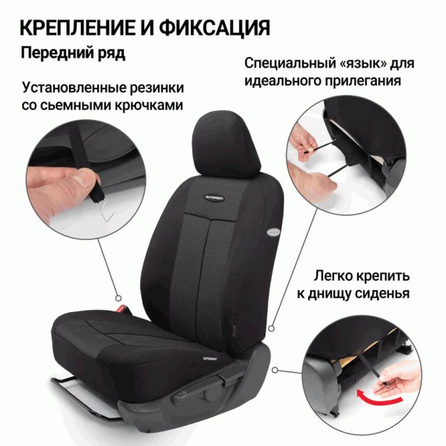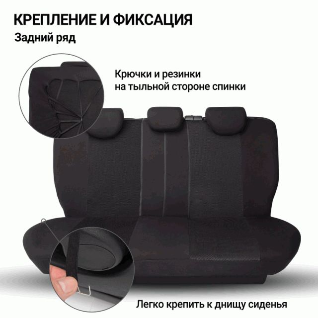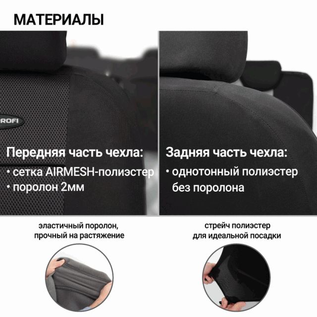 Ткань хорошо пропускает воздух и отводит влагу, достаточно эластична, чтобы хорошо садиться на сиденья, но при этом прочная и устойчива к растяжению.
