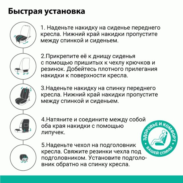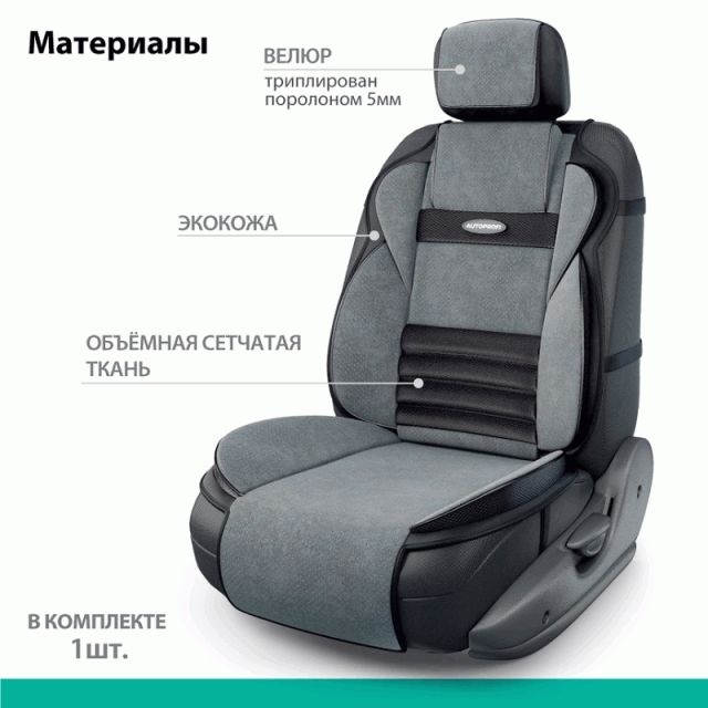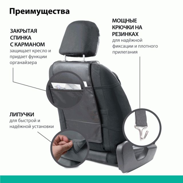 • Универсальная конструкция накидок подходит для большинства автомобильных сидений.
