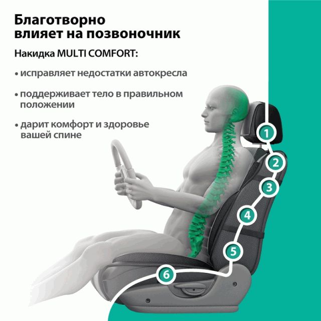 Ортопедическая накидка на переднее сиденье MULTI COMFORT MLT-320 BK/D.GY обеспечивает полную анатомическую поддержку водителя. Объемные вставки поддерживают голову, плечи, спину, поясницу, бедра.