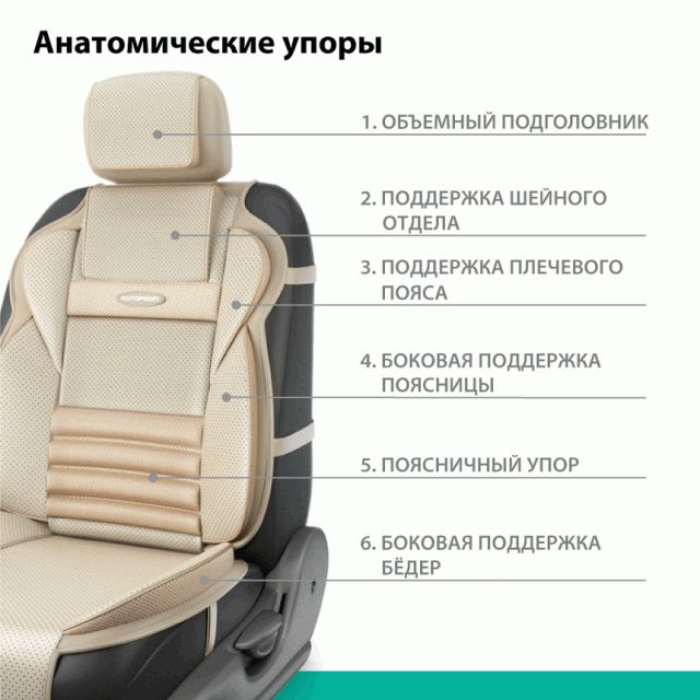 Анатомическая накидка на переднее сиденье MULTI COMFORT MLT-320G BE бежевого цвета обеспечивает полную анатомическую поддержку водителя. Объемные вставки поддерживают голову, плечи, спину, поясницу, бедра.