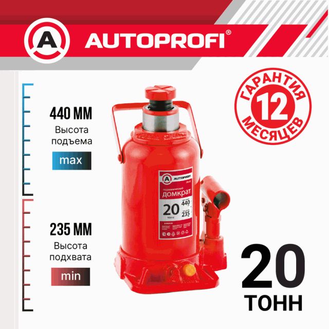 Автомобильный гидравлический домкрат с рабочей высотой до 440 мм. В сложенном состоянии занимает всего 235 мм по высоте. Максимальный груз — 20 тонн. Встроенная защита от перегруза. Перепускной клапан допускает перегрузку на 25%, но препятствует использованию домкрата при недопустимой нагрузке. Бутылочный домкрат предназначен для работы на твердой и ровной поверхности. После подъема груза он должен быть зафиксирован на страховочных опорах (продаются отдельно).