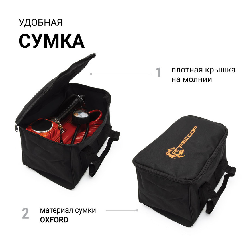Мощный автомобильный компрессор в металлическом корпусе. Одна из самых мощных моделей в России. Производительность — 160 л/мин при максимальном давлении 10 атм. Отличное решение для грузовых автомобилей, тракторов, крупных внедорожников, микроавтобусов. Встроенная защита от перегрева. Электропитание компрессор получает от клемм аккумулятора. В комплекте идут переходники для накачки велосипедных шин, лодок, матрасов и переходник на клеммы АКБ. До 20 минут беспрерывной работы. Поршень с уплотнительным кольцом сделан из гибкого жаропрочного тефлона. Для регулировки давления в шинах компрессор укомплектован перепускным клапаном. В качестве смазки используется несменяемое силиконовое масло. Металлический корпус компрессора устойчив к коррозии и эффективно охлаждается во время работы. Для смазки в компрессоре используется «вечное» силиконовое масло. Оно сохраняет свои качества в течение всего срока службы изделия и не требует замены или доливки. Шланг компрессора изготовлен из полиуретана, и поэтому не теряет эласт