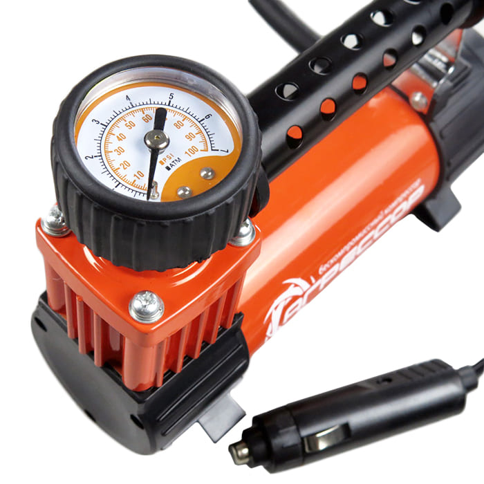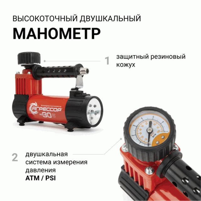 Цельнометаллический корпус компрессора устойчив к коррозии и эффективно охлаждается во время работы. Поршень двигателя оснащён уплотнительным кольцом из гибкого жаропрочного тефлона, которое обеспечивает продолжительную безотказную работу насоса. Для смазки в компрессоре используется инновационное силиконовое масло. Оно сохраняет свои качества в течение всего срока службы изделия и не требует замены или доливки. Питание компрессора осуществляется от прикуривателя автомобиля. Без перерыва компрессор способен проработать до 30 минут.Поршень с уплотнительным кольцом сделан из гибкого жаропрочного тефлона. AGR-30L — это компактный автомобильный компрессор в металлическом корпусе со встроенным светодиодным фонарем. Производительность в 30 л/мин будет отличным решением для владельца легкового автомобиля с диаметром шин R14 / R13 и меньше.