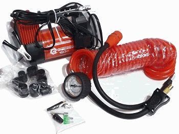 Яркий металлический корпус компрессора устойчив к коррозии и эффективно охлаждается во время работы. Поршень двигателя оснащён уплотнительным кольцом из гибкого жаропрочного тефлона, которое обеспечивает продолжительную безотказную работу насоса. Для смазки в компрессоре используется инновационное силиконовое масло. Оно сохраняет свои качества в течение всего срока службы изделия и не требует замены или доливки. Шланг компрессора изготовлен из полиуретана, и поэтому не теряет эластичность даже при низких температурах. Насадка шланга покрыта термопластом, который оберегает руки от соприкосновения с металлом штуцера шланга, холодным в мороз или горячим после работы насоса. Кроме этого, в шланг встроен высокоточный двушкальный манометр и перепускной клапан, предназначенный для выравнивания давления в шинах. Питание компрессора осуществляется от аккумулятора автомобиля, к которому он подключается через зажимы АКБ.