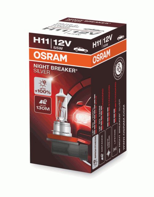 NIGHT BREAKER SILVER – яркая галогенная лампа OSRAM с оптимальным сроком службы. По сравнению с требованиями стандарта, она обеспечивает до 100% больше яркости, образуемый световой луч до 130 м длиннее. Это позволяет распознавать препятствия, опасности и дорожные знаки раньше и реагировать на них быстрее. Кроме того, NIGHT BREAKER SILVER отличаются отличным соотношением цены и качества и современным дизайном с серебристым колпачком.