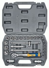 Набор торцевых головок и принадлежностей 26 предметов позволяет производить слесарно-монтажные работы с крепежом в диапазоне размеров 8-32мм, полнофункциональный набор принадлежностей для работы с приводом ½''Dr. (12,7мм). Весь инструмент производится из высококачественных сплавов, обеспечивающих долгое и надёжное применение, а удобные двухкомпонентные рукоятки придают комфортность и легкость любым слесарно-монтажным операциям. Весь инструмент сертифицирован и соответствует либо превосходит самые высокие требования стандартов профессионального инструмента. Состав набора инструментов ½'' 26 пр. Торцевые головки ½'' 6 граней (20шт.): 8;9;10;11;12;13;14;15;16;17;18;19;20;21;22;23;24;27;30;32 Вороток Тобразный ½'' Торцевые головки свечные (2шт.): 16; 21 Удлинитель ½'' (2шт.): 125, 250mm Рукоятка трещоточная с быстрым сбросом ½'' 250mm (72 зубца, двухкомпонентная)