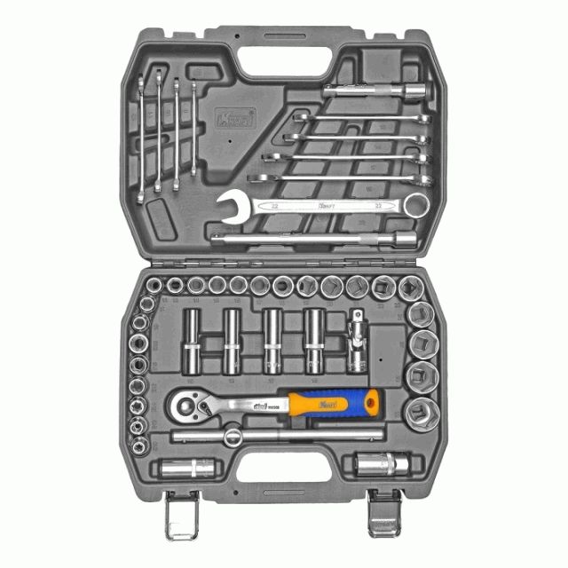 Набор инструмента из 44 предметов базовой комплектации позволяет производить обслуживание резьбовых соединений в диапазоне размеров 8,10-32 мм, а также профилем E-star (внешний TORX) E10,E12,E14,E16,Е18,Е20. Это полнофункциональный набор торцевых головок и принадлежностей для работы с приводом ½''Dr.(12.7 мм).
