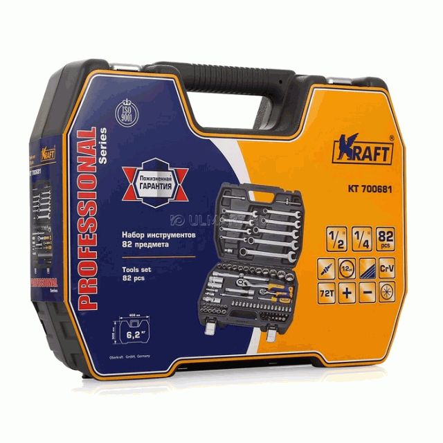 Полнофункциональный набор инструмента "Kraft" из 82 предметов с торцевыми головками и 12-гранным рабочим профилем популярной комплектации, позволяет производить слесарно-монтажные работы с различными типами крепежа в широком диапазоне размеров от 4 до 32 мм. Сертифицирован и соответствует либо превосходит самые высокие требования стандартов профессионального инструмента. Набор предназначен для обслуживания автомобилей. Весь инструмент производится из высококачественных сплавов, обеспечивающих долгое и надёжное применение, а удобные двухкомпонентные рукоятки придают комфортность и легкость любым слесарно-монтажным операциям.