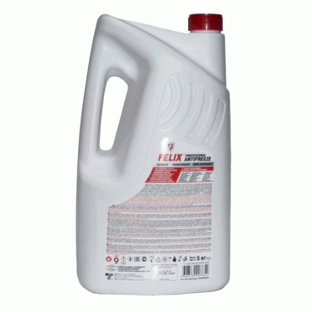 Антифриз FELIX Carbox 5кг G12+ красный Антифриз FELIX CARBOX представляет собой антифриз на основе этиленгликоля высшего сорта и специально очищенной воды. Не содержит нитриты, амины, фосфаты, бораты и силикаты. В качестве ингибиторов коррозии используются соли органических кислот. В ассортименте появился новый продукт для высоконагруженной техники, работающей в тяжелых условиях - FELIX Carbox SQ (тип OAT) Представляет собой антифриз на основе этиленгликоля высшего сорта и специально очищенной воды. Разработан специально для грузовой и специализированной техники, работающей в тяжелых условиях эксплуатации. Новый состав с использованием нитритов и молибдатов противодействует кавитационной коррозии при высоких температурах. В качестве ингибитора коррозии используется пакет органических присадок. Не содержит амины, фосфаты, бораты и силикаты. Обладает официальным одобрением ASTM D 6210, подтвержденное международной аккредитованной организацией «ABIC Testing Laboratories INC». Соответствует требованиям ASTM D