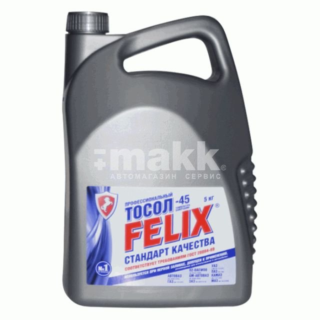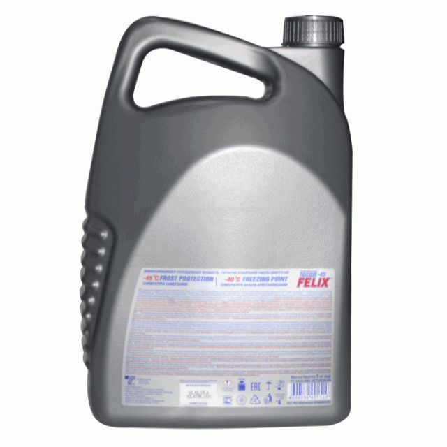 Тосол 45 FELIX 5кг Профессиональный тосол FELIX – 45 – это современная охлаждающая жидкость, соответствующая требованиям международных стандартов. Обеспечивает 100% защиту двигателя и деталей системы охлаждения от коррозии, перегрева, замерзания до -45°С - специальная формула присадок обеспечивает мгновенную защиту деталей системы охлаждения во всем диапазоне рабочих температур и давлений. По сравнению с обычными тосолами обладает увеличенным ресурсом эксплуатации – 120 000 км без замены (Протокол № 32532/074-04 АвтоВАЗа). Единственный российский тосол, успешно прошедший полный цикл испытаний на российских автозаводах, и допущенный к первой конвейерной заливке. Не содержит амины и нитриты, образующие вредные для здоровья нитрозоамины и другие канцерогенные соединения. - Неагрессивен к резиновым изделиям и металлам, в том числе алюминию - Имеет низкую испаряемость и пониженное пенообразование - Сохраняет стабильность при высоких и низких температурах - Препятствует образованию накипи - Соответствует